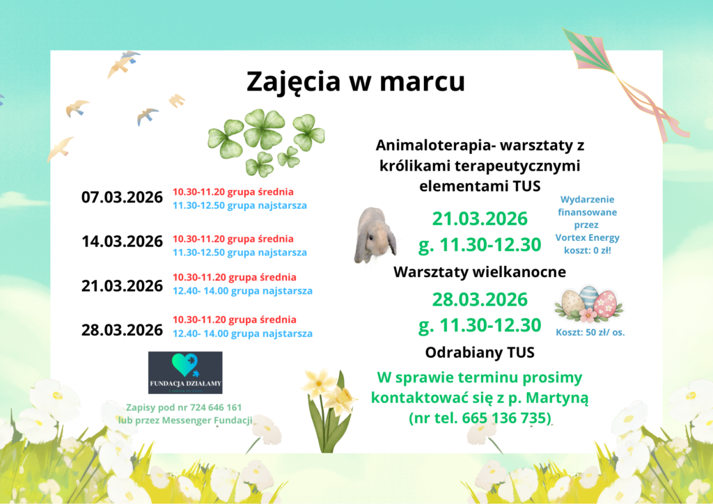 Przedstawiamy plakat na zajęcia w marcu. Terapie odbywają się przy ul. Żubrów 1. Prosimy o zapoznanie się z plakatem, bo są małe zmiany godzin dla najstarszych uczestników TUS.